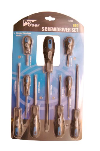 This 9 pc screwdriver set is manufactured from chrome vanadium steel and contains the following sizes:- Cross point: 0 x 75 mm, 1 x 150 mm, 2 x 38 mm. 2 x 100 mm Slotted:6 x 38 mm, 3 x 75 mm, 6 x 100 mm, 5 x 150 mm, 8 x 200 mm